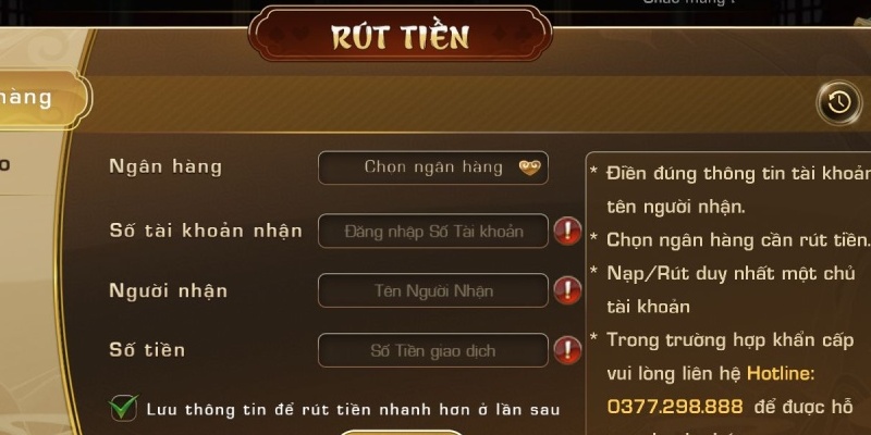 Bước 3: Lựa chọn phương thức rút mà người chơi đang mong muốn sử dụng rồi điền vào những thông tin cần thiết, gồm số tiền muốn rút và thông tin tài khoản nhận tiền.